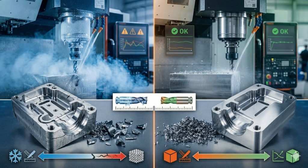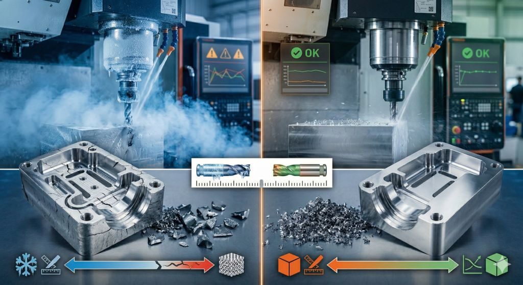 Pénétrez dans presque n'importe quelle usine, jetez un œil à travers la vitre en polycarbonate d'une fraiseuse CNC, et vous verrez probablement une scène familière : un outil de coupe complètement immergé dans un torrent impétueux de liquide de coupe. Le raisonnement derrière cela semble imparable. La coupe du métal génère une friction considérable. La friction crée une chaleur extrême. La chaleur est l'ennemie jurée d'un outil de coupe. Par conséquent, bombarder la zone de coupe avec un véritable tsunami glacé de liquide de refroidissement à haute pression devrait être la meilleure façon de préserver vos fraises coûteuses et d'obtenir un état de surface parfait, n'est-ce pas ? Eh bien, pas exactement. Aussi contre-intuitif que cela puisse paraître, pousser la pompe de refroidissement à son maximum peut parfois être le moyen le plus rapide de détruire vos outils. Examinons la physique des fluides de coupe, les dangers insoupçonnés du « surrefroidissement » et pourquoi l'usinage moderne redéfinit les règles de la maîtrise de la température.